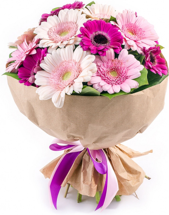 2 розовых гермини, 3 фиолетовых гермини, зелень, упаковка, лента4 розовых гермини, 3 фиолетовых гермини, зелень, упаковка, лента7 розовых гермини, 6 фиолетовых гермини, зелень, упаковка, лента