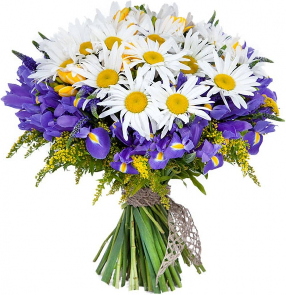 3 ромашки, 7 ирисов, 2 солидаго, лента9 ромашек, 15 ирисов, 5 солидаго, лента17 ромашек, 29 ирисов, 11 солидаго, лента